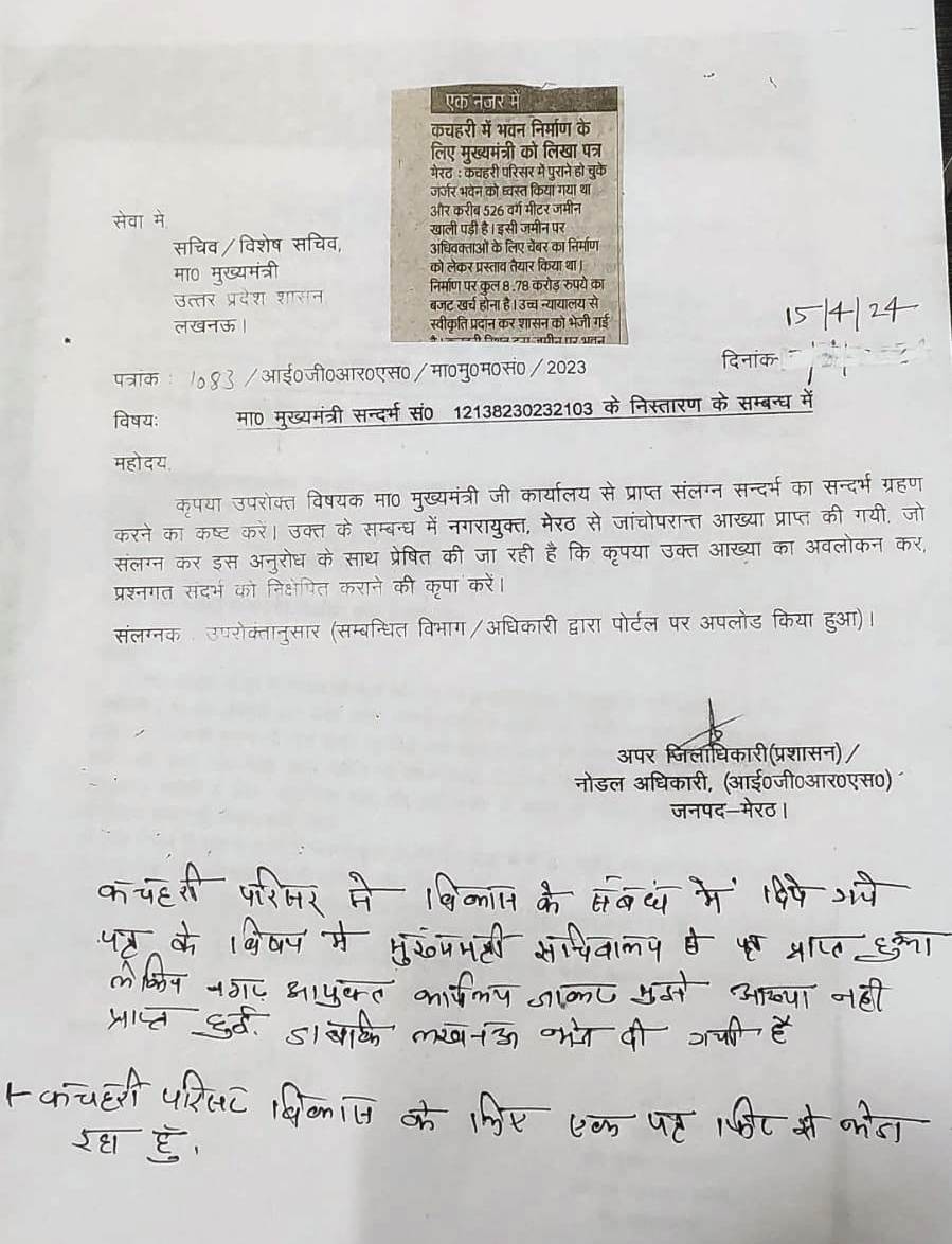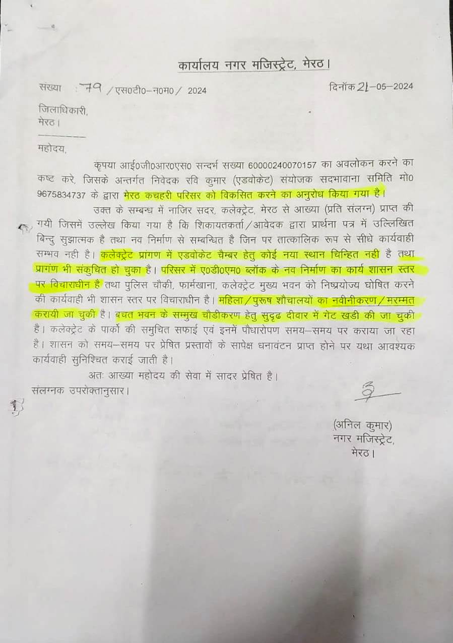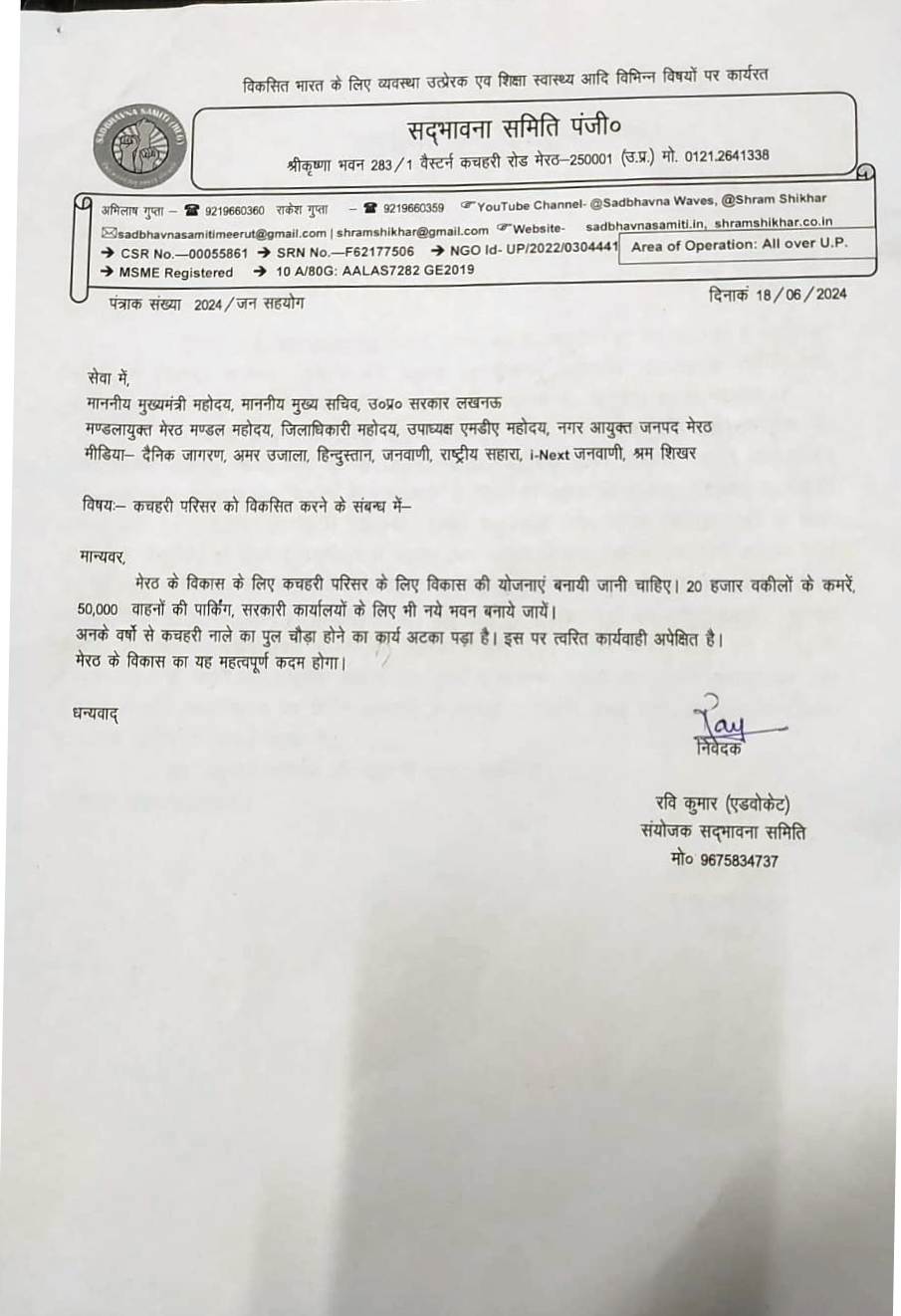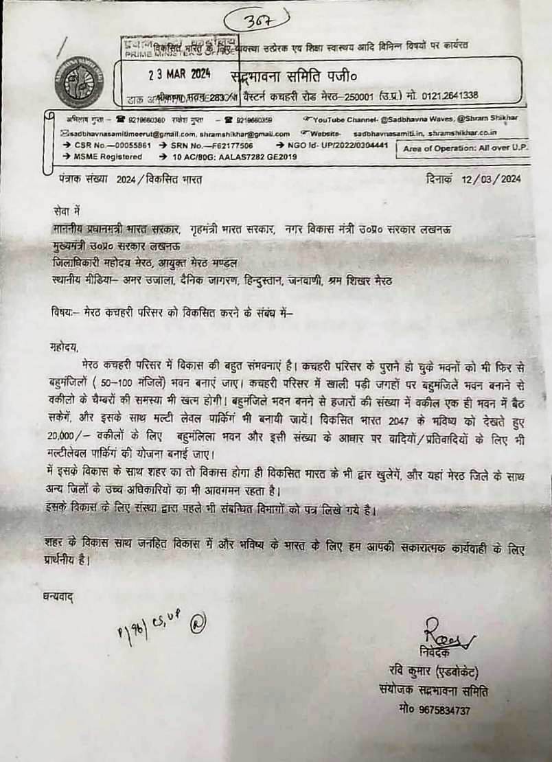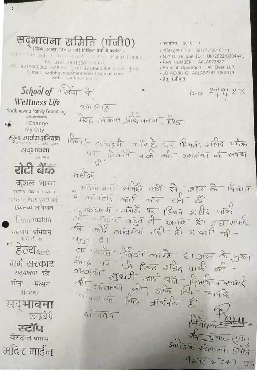 Sadbhavna Samiti is Continously working for the development of public intrest community development, in this regard details o fthe efforts made for the development of kutchery meerut. First of all, on 20-09-2023, A letter was written to MDA for the cleanliness and development of the Traingular Park at Sheed Chowk located at Kutchery intersection west. in reply by MDA, on 30-09-2023, it was told that the resposnsibility of arrangeing city Parks lies with the Municipal corporation, Hence your letter is being forwarded to the municipal corporation Well Now this Park has been Developed in the same series, on 15-02-2024, there was mention of the developed of the kutchery in which 50 to 100 stored Building Parking and arragements for sitting of lawyers were mentioned. even, on 12-03-2024, letter were written to the central government an state governement for the development of the Kutchery. on 15-04-2024, a letter from the special secretary was recevied by Cheif Minister Office in which the Municipal Commissnor was asked to taked action after investigation. on 21-05-2024, a letter was recevied from the District Magistrate in which work was asked to renovate the toilets at the ADM Block and widen the Road in front of Bachat Bhawan. on 18-06-2024, a letter were written for rooms for twety thousands lawyers and Parking of 50 thousands vehicles in the kutchery Premises and widening the bridge of the Kutchery drain. To which we have not recevied any answer yet. Ravi Kumar Advocate (Cordinator) Mob. 9675834737